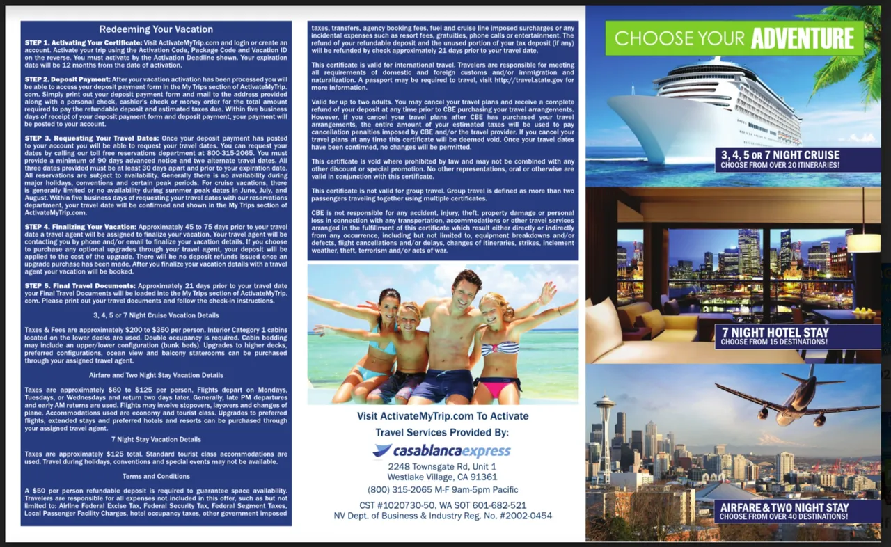 This certificate has no cash value and is non-transferable or renewable. This promotional certificate is void where prohibited by law and is not valid for distributors, employees, or family members of distributors and employees. Fulfillment of this certificate is the sole and exclusive obligation of CSNG. This offer cannot be used concurrently with any other travel offer. CSNG reserves the right to offer alternative travel dates, accommodations, departure ports, and destinations. Responsibilities: Neither CSNG nor the distributor of this offer assumes any liability or responsibility for damage, expense, or inconvenience, nor for loss, injury, death or damage to any persons or property or liability whatsoever due to delays and/or cancellations regardless of cause. CSNG assumes no responsibility for any verbal or written representation made in conjunction with this offer by any distributor and/or their agents other than those included in this offer. CSNG and the distributor of this offer are independently owned and operated. The distributor of this promotional certificate is not responsible for any obligations of CSNG, for any representations of obligations of CSNG, or for content of this promotional certificate. Customer Service Network Group: (CSNG) PO Box 24527, Fort Lauderdale, FL 33307-4527, gocrv.com 954.525.1777 for assistance, have certificate number available to expedite service. CSNG is registered with the state of Florida as a Seller of Travel, Registration No. 17213. CSNG is a licensed California Seller of Travel, Reg. No 2025280 (registration as a Seller of Travel does not constitute approval by the State of California). California law requires certain Sellers of Travel to have a trust account or bond. This business has a bond in the amount of $20,000 issued by International Securities LTD. Seller of Travel Licenses: California # 2025280; Washington # 602 005 020; Hawaii # TAR-5681. Retail Value of this certificate is $300.