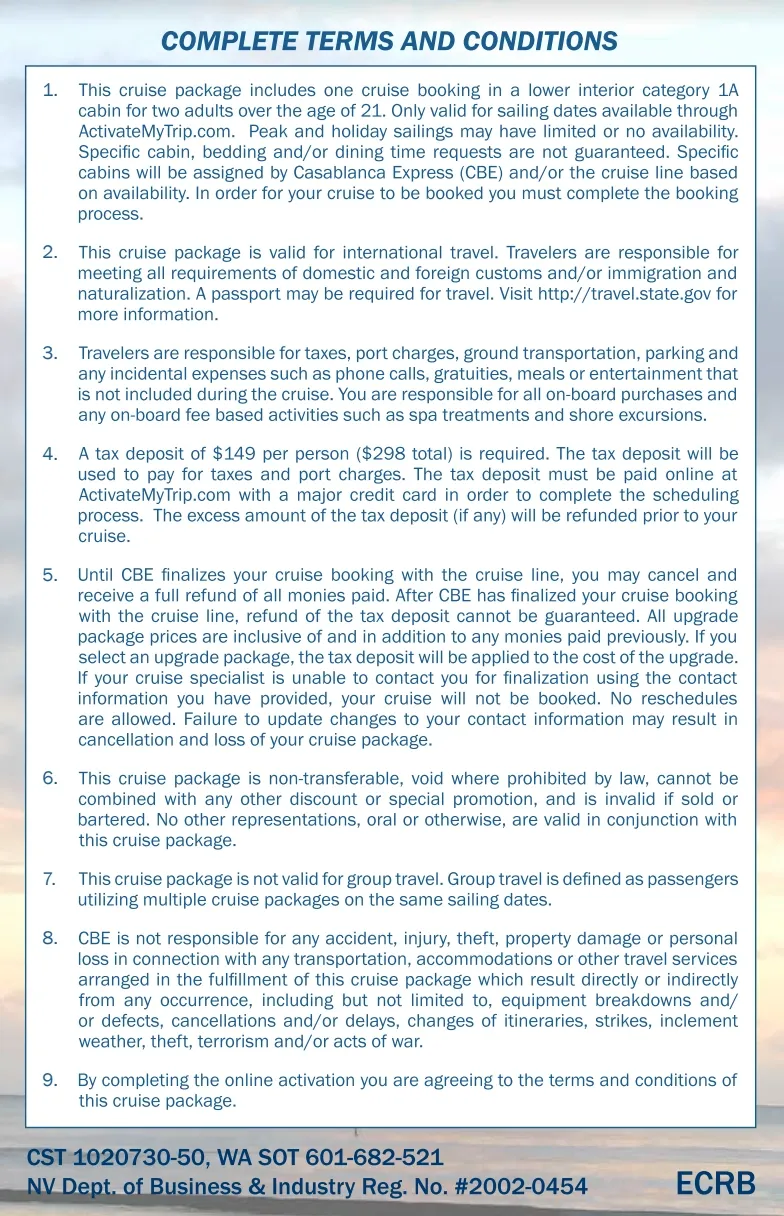 This Promotional Certificate is Not Free, Deposits, Government Taxes, Carrier and Agency Imposed Fees are Required and to be Paid by Registered Individual who must be one of the Travelers Registration of this promotional travel certificate: must occur within 6 months from the issue date, by the individual that received this certificate. Certificates registered outside of the registration period are subject to being voided. Only one registration per certificate number is eligible. Registration is performed online @ gocrv.com. Registration process requires the registering individual to provide their complete name and contact information, along with a valid email address and contact phone numbers. The email address provided will require opt in validation at the start of the registration process. Following a successfully completed registration, a registration confirmation email will be sent. Registration requires acknowledgement of review and understanding of terms and conditions as well as agreeing to being contacted by Customer Service Network Group, (CSNG) its vendors and servicing providers electronically, by U.S. mail or phone on matters related to this promotional certificate. The expiration of this promotional certificate is defined on the face of the certificate. Travel must be completed before the expiration date. Travel Itinerary Selection: Following a valid registration, the authorized registered individual will select a travel itinerary at gocrv.com. Travel itinerary selection requires two (2) travel itinerary begin dates to be selected, a preferred and an alternative from the provided itinerary calendar. All dates selected must be at least 45 days in advance of the date the selection is being made. At least 30 calendar days must separate the two dates selected. Only valid travel days, dates and seasons will be offered for selection as defined on the promotional certificate. Other travel selections may be required and are based on the promotional certificate, including departure city, arrival city, and or departure cruise port. Cruise itineraries presented will be that of actual sailings. All availability will be determined at the time of booking and confirmation. Reservation Deposit: Following a travel itinerary selection, the Reservation Save the Date Deposit is due. The Reservation Save the Date Deposit amount is defined on the promotional certificate (see Reservation Save the Date Deposit). The Reservation Save the Date Deposit must be paid and posted to the travel certificate account for the selected travel itinerary to be activated. Once the Reservation Save the Date Deposit is paid and posted, the promotional certificate account will be placed in the itinerary activated status. Reservation Save the Date Deposit must be paid within 30 days of the itinerary selection, or the itinerary selected will be inactivated requiring the registered individual to reselect a valid travel itinerary. The registered promotional certificate holder will be notified by email when this occurs. The promotional certificate account may be cancelled (see Cancellation of Certificate) at any time prior to a reservation being confirmation. At the time a proper cancellation is processed, all refundable deposits paid will be refunded in the form of a check. If the registered individual fails to comply with the Terms and Conditions of this travel certificate offer or fails to respond within a timely manner to correspondence received, they will forfeit all refundable deposits paid at the expiration date of the promotional certificate. Reservation Confirmation: Within the defined number of days of the certificate account being placed in itinerary activated status an email communication will be sent inviting the registered promotional certificate holder to the booking facility assigned to the promotional certificate. Booking facility may be the CSNG reservation center or a web page provided by CSNG. A prompt response to the invitation offers the best opportunity to secure one of the travel dates and or itineraries selected. Only named individuals on the certificate account in the itinerary activated status have access to the reservation center, web sites and reservation specialists. Reservation center hours of operation are available online @ gocrv.com. During the reservation process, prior to confirmation, named individuals on the certificate account will be verified and charges associated to this promotional offer will be collected (see Charges section below). Failure to identify all travelers and their accurate years of age at the time of booking, may result in additional costs to the traveler at check in, which will be the responsibility of the travelers. If CSNG is unable to secure availability for the itinerary selected, alternate arrangements will be offered. Following the reservation confirmation of travel, an electronic reservation confirmation with instructions and itinerary details will be sent to the email address on the certificate account within 72 hours. Named individuals on the certificate account may need to obtain other electronic travel documents from travel partner or the travel partner’s website. If airline flights are part of the travel certificate, airline schedules offered are at the discretion of CSNG who will select departure and arrival airports in cities where multiple major airline carriers operate. Flights generally depart between 3 p.m. and 10 p.m. and return between 6 a.m. and 1 p.m. Flight schedules are at the discretion of the travel provider. Commercial and charter airlines are utilized and no guarantee is made for a specific airline, route or itinerary. When cruise itineraries are included coordination of air travel is required and will require arrival the day before the sailing to ensure sufficient time for named individuals to arrive at the departure port. At least one adult over the age of 21 is required on all reservation confirmations. Travelers under the age of 21